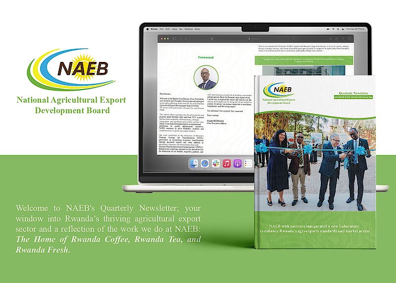 The National Agricultural Export Development Board (NAEB) is pleased to present the Quarter IV Newsletter for the 2024–2025 Fiscal Year, a window to Rwanda’s thriving agricultural export sector and a reflection of the work we do at the National Agricultural Export Development Board (NAEB): The Home of Rwanda Coffee, Rwanda Tea, and Rwanda Fresh.